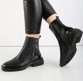 این بوت خاص با تلفیق هنرمندانهی چرم ساده و چرم طرح کروکو طراحی شده تا در عین سادگی، جلوهای لوکس و چشمگیر داشته باشد. بافت متفاوت کروکو در کنار چرم نرم و باکیفیت، استایلی مدرن و بهروز خلق کرده که بهراحتی با مانتو، پالتو و استایلهای روزمره یا نیمهرسمی ست میشود.