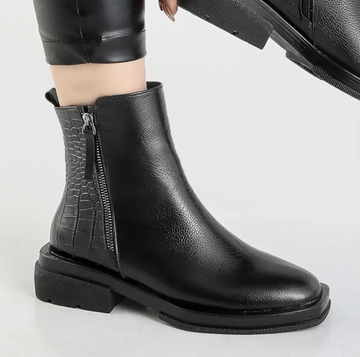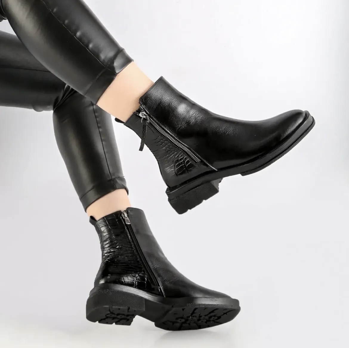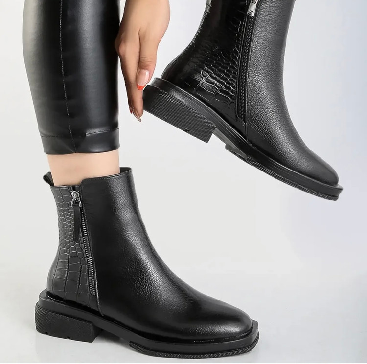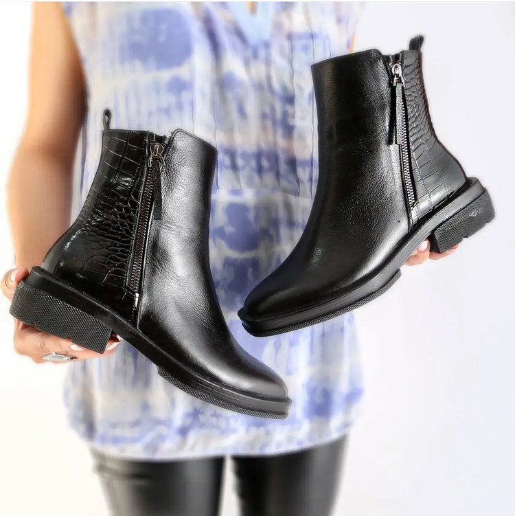 این بوت خاص با تلفیق هنرمندانهی چرم ساده و چرم طرح کروکو طراحی شده تا در عین سادگی، جلوهای لوکس و چشمگیر داشته باشد. بافت متفاوت کروکو در کنار چرم نرم و باکیفیت، استایلی مدرن و بهروز خلق کرده که بهراحتی با مانتو، پالتو و استایلهای روزمره یا نیمهرسمی ست میشود.